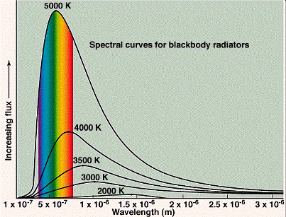 In the late 1800s, physicists were making accurate measurements of the spectra of the emissions from black bodies (objects which are opaque, or highly absorbing, to the light they emit). Good examples of black bodies are the sun, the filament of an incandescent lamp, and the burner of an electric stove. The color of a black body depends on its temperature: A cool body emitting radiation of long wavelengths, i.e., in the radio frequency range or in the infrared which are invisible to the eye, a warmer body emitting radiation which includes shorter wavelengths and appearing deep red, a still warmer body emitting radiation which includes still shorter wavelengths and appearing yellow, and a hot body emitting even shorter wavelengths and appearing white. The emissions are always over a broad range of colors, or wavelengths, and their appearance is the net result of seeing all of the colors at once. Examples of various blackbody spectra are shown below. Computer simulations are given at http://ephysics.physics.ucla.edu/physlets/eblackbody.htm.