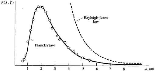 Classical physics could not explain the spectra of black bodies. It predicted that the intensity (power emitted at a given wavelength) of emitted light should increase rapidly with decreasing wavelength without limit (the "ultraviolet catastrophe"). In the figure below, the curve labeled "Rayleigh-Jeans law" shows the classically expected behavior.