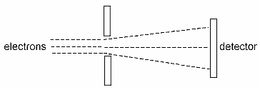 In other words, the more accurately we know the position of the electron (the smaller Dq is), the less accurately we know the momentum (the larger Dp is). Since momentum is mass times velocity, the uncertainty in momentum is equivalent to an uncertainty in velocity. The uncertainty in velocity is in the same direction as the uncertainty in position. In the drawing above, the uncertainty in position is a vertical uncertainty. This means that the uncertainty in velocity is also a vertical uncertainty. This is represented by the lines diverging (by an uncertain amount) after the electrons emerge from the hole (uncertain vertical position) rather than remaining parallel as they are on the left.