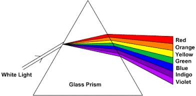 Physicists measure the spectrum (the intensity of light as a function of wavelength, or color) of a light source in a spectrometer. The figure below shows a schematic drawing of a simple prism spectrometer. White light comes in from the left and the prism disperses the light into its color spectrum.